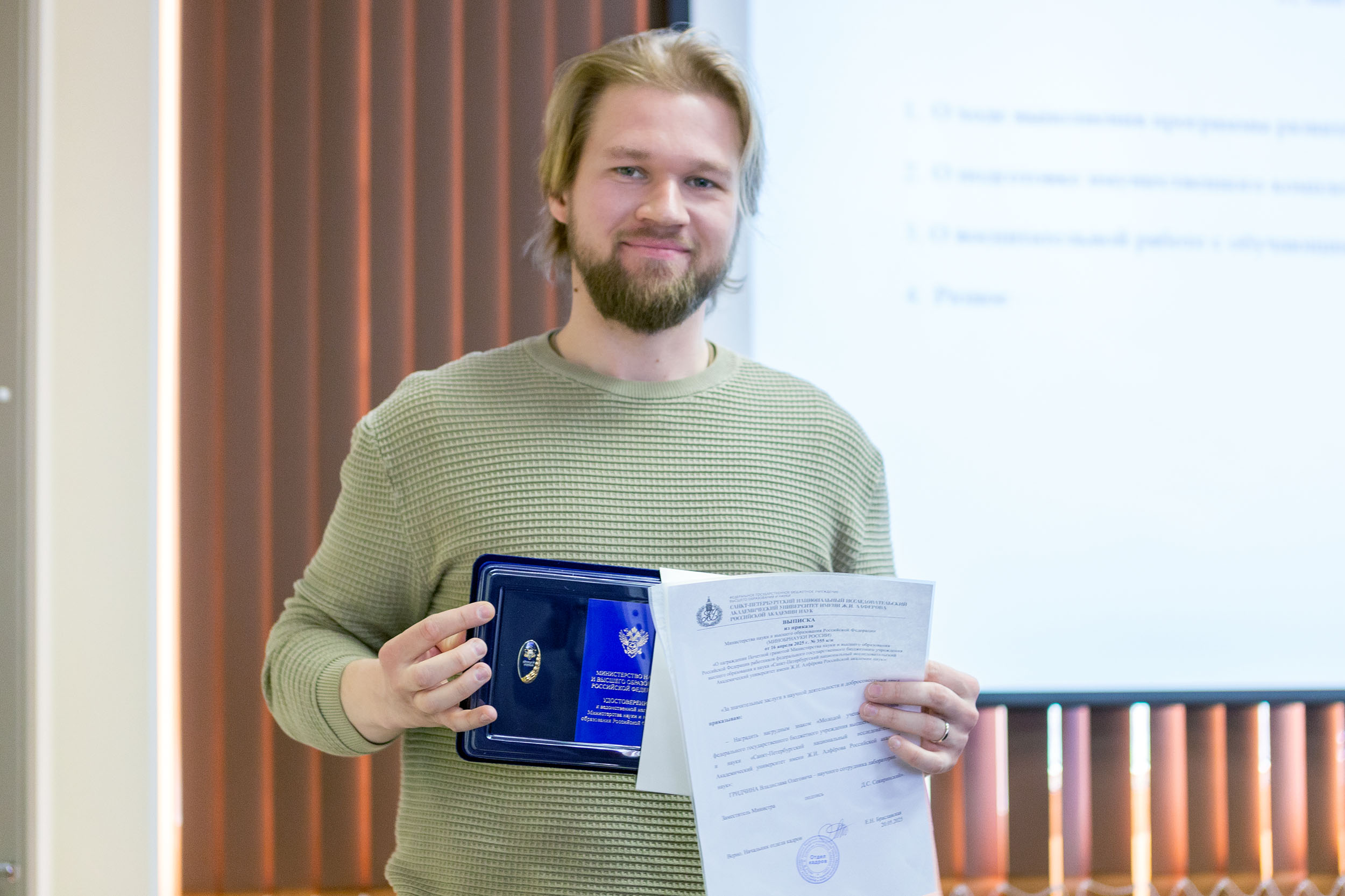 Заседание началось с приятного события: трое молодых исследователей университета были удостоены ведомственной награды Министерства науки и высшего образования РФ — нагрудного знака «Молодой учёный». Поздравляем: